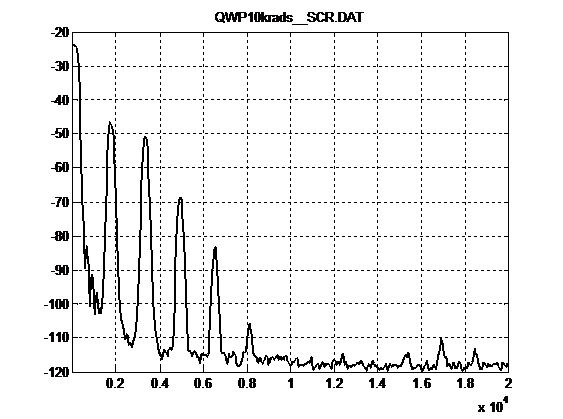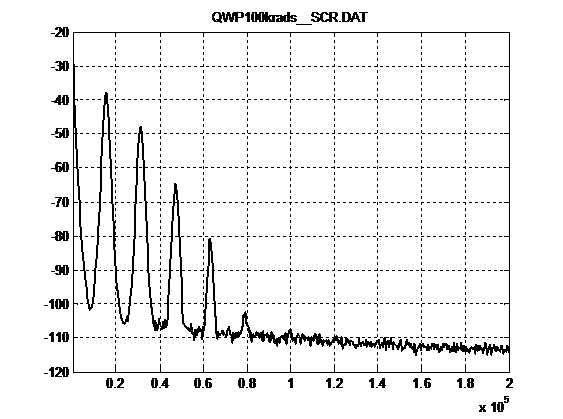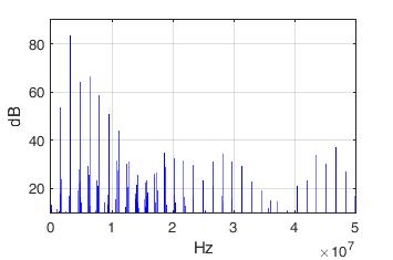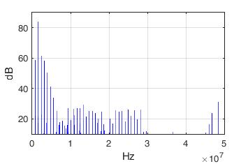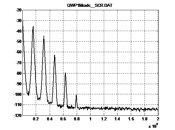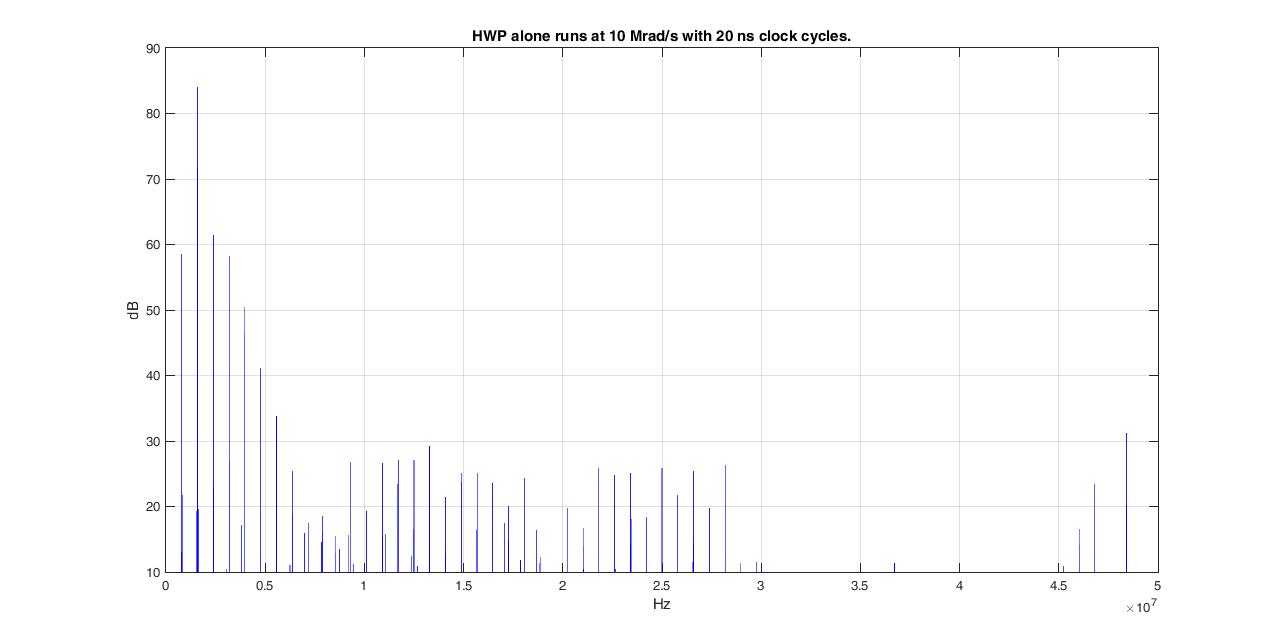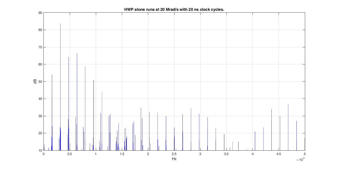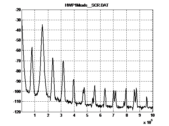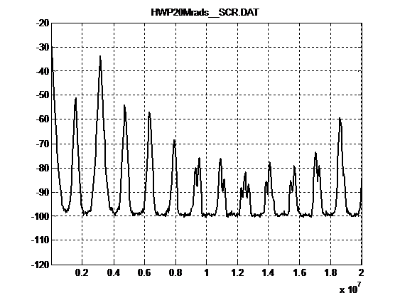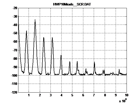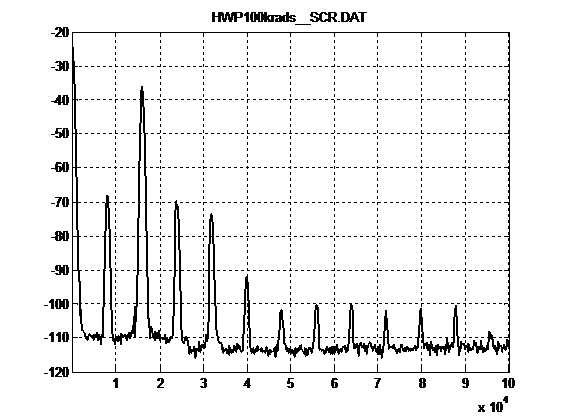 Polarisationsverwürfler EPS1000 mit standardmäßigen 40-ns Taktzyklen.Aufgenommen mit elektrischem Spektralanalysator. Horizontale Achse: Hz; Vertikale Achse: 10 dB/div.