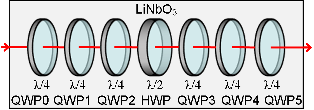 Alle Wellenplatten laufen: QWP1, QWP2, HWP, QWP3, QWP4. Ganz rechts: HWP rotiert schnell. Überall sonst, auch unten: HWP rotiert langsam. QWP0 und QWP5 sind hier nicht implementiert. | |