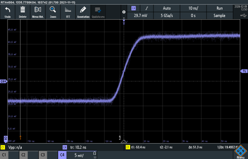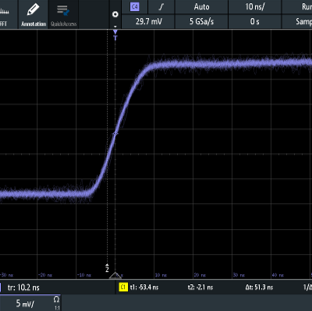 Electroptic step response 10 ns of EPS1000-80M, measured with photodiode behind polarizer. Horizontal: 10 ns/div. Vertical: not to scale. |