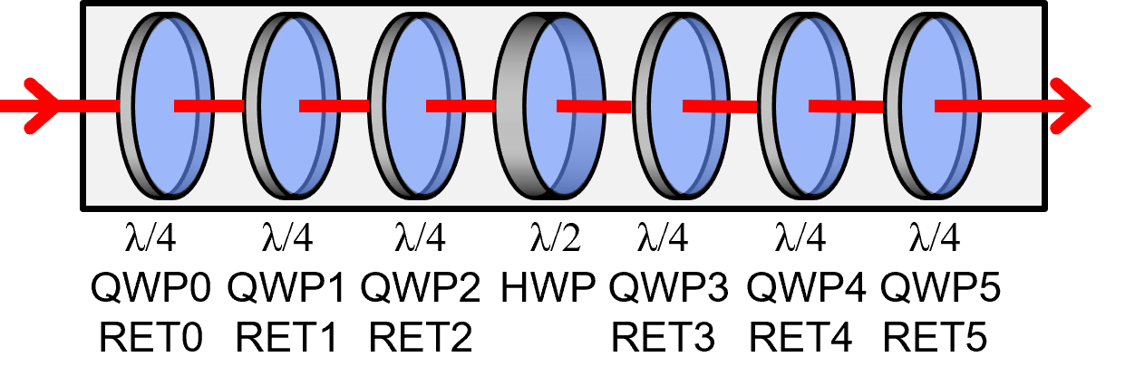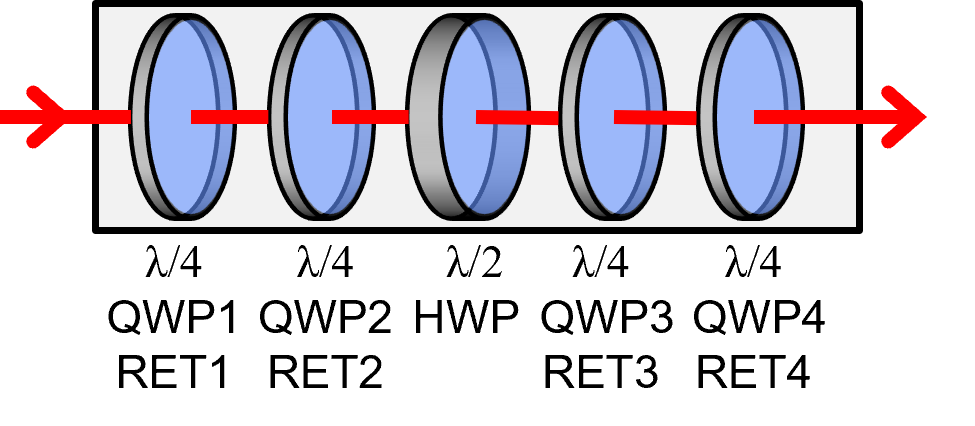 Rotating QWPs have time-variable orientation. When also retardation is time-variable a QWP becomes a linear retarder (RET). One can switch between QWP and RET operation. RET operation improves scrambling randomness. Therefore RET1, RET2, HWP, RET3, RET4 behave very siimilar to the established QWP0, QWP1, QWP2, HWP, QWP3, QWP4, QWP5. But with 5 rather than 7 waveplates, EPS1000-XXM (20 < XX ≤ 80) is a lot faster than the traditional EPS1000-20M.